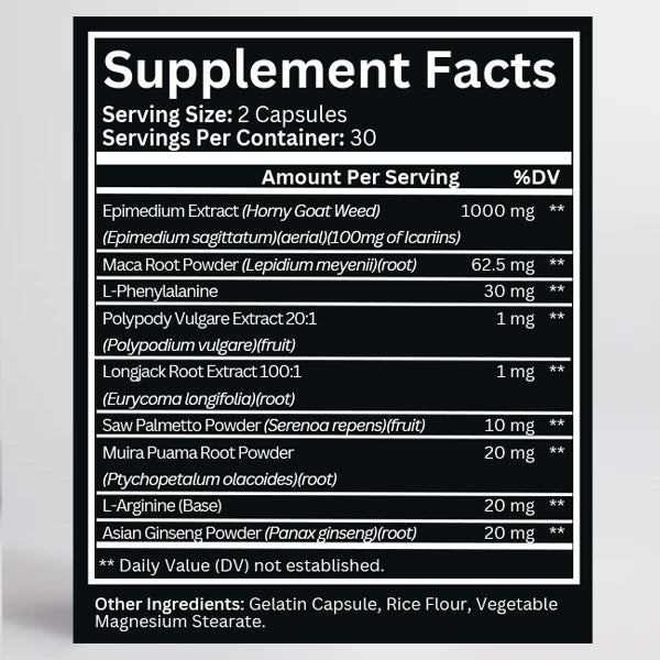 Epimedium Extract, Maca Powder, L-Phenylalanine, Polypody Vulgare Extract, Longjack Root Extract, Saw Palmetto Powder, Muira Puama Powder, Asian Ginseng Powder, L-Arginine